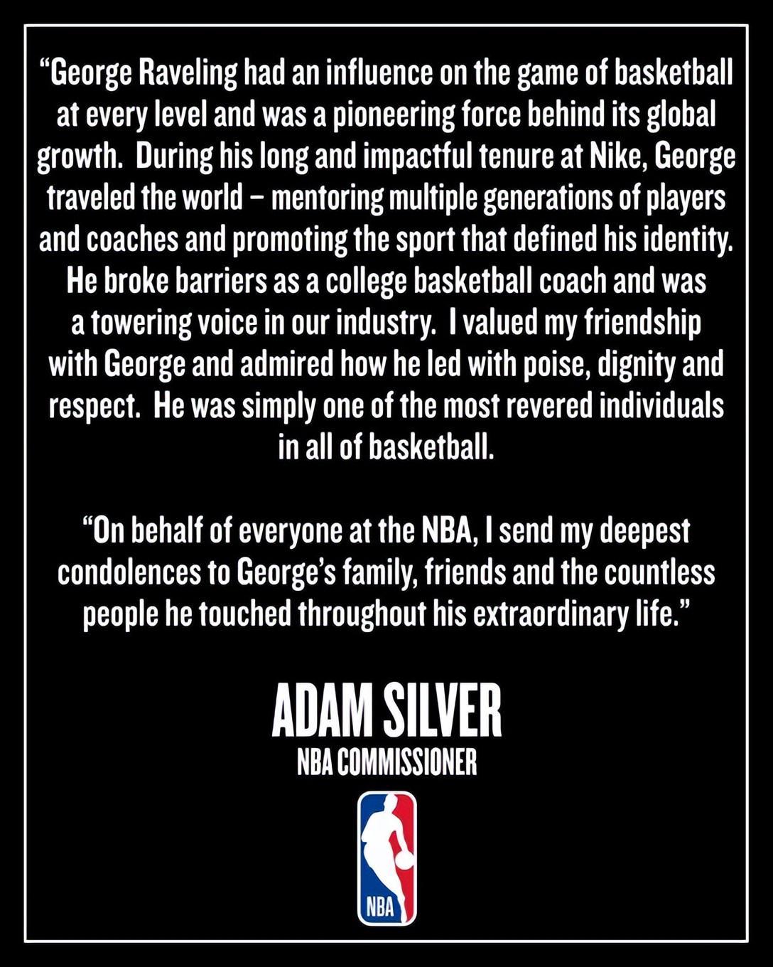 “作为大学篮球教练,他打破了行业壁垒;在篮球领域,他的声音极具分量。我珍视与乔治的友谊,也钦佩他始终以沉稳、庄重与尊重的态度待人处事。他无疑是整个篮球界最受敬仰的人物之一。谨代表NBA全体成员,向乔治的家人、朋友,以及所有在他非凡一生中受其影响的人们,致以最深切的哀悼。”